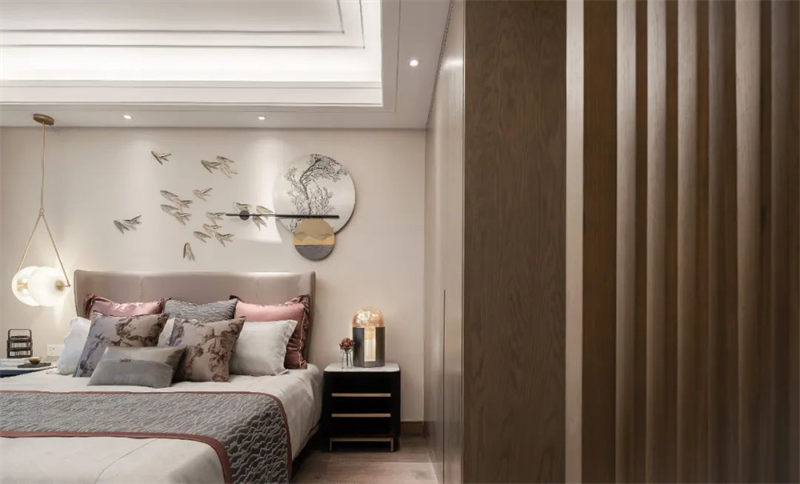 主卧传统的中式元素与现代的简约设计完美结合,呈现出典雅与舒适的空间氛围。东方韵味的床头背景装饰,加上简约时尚的吊顶和灯饰,融合了新中式和现代元素,呈现出独特的古典美感。使整个空间在保留传统文化精髓的同时,更显现代时尚。