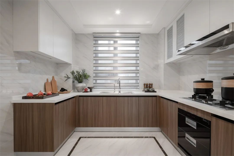厨房“U”字形的橱柜设计,完美的动线让空间整洁有序,定制的嵌入式厨电设计让操作更加便捷。典雅的大理石台面与淡雅的木纹橱柜完美配合,使整个厨房设计更加自然和谐。