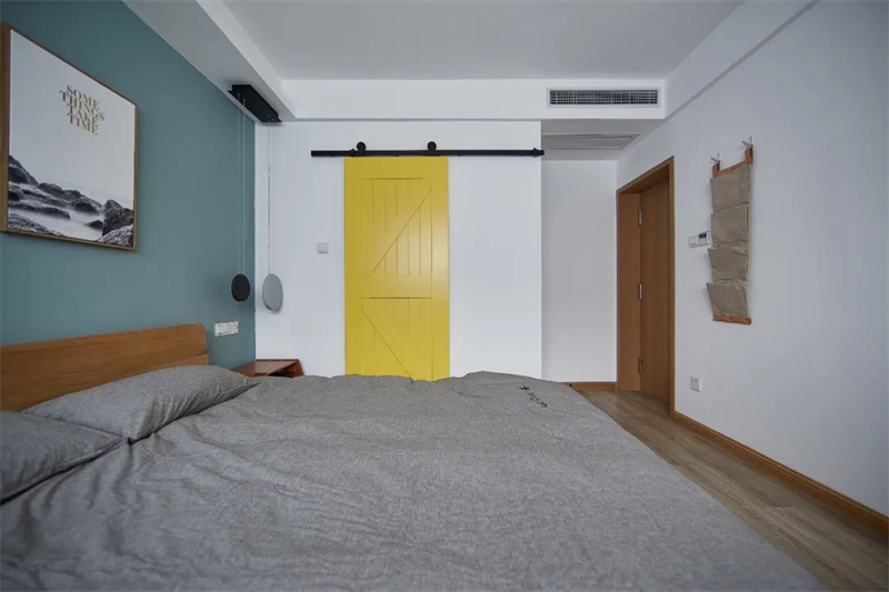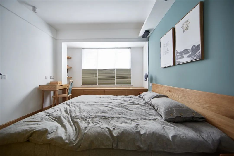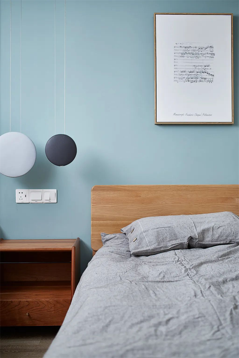 主卧室墙面是明亮的白色,蓝色的床头背景与灰色的床品组合,加上原木地板和实木家具,给空间带来清新的自然感。主卧室的照明设计考虑到了夜间舒适的用光需求,包括床头台灯和壁灯,打造完美的休憩空间。