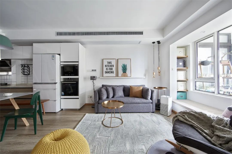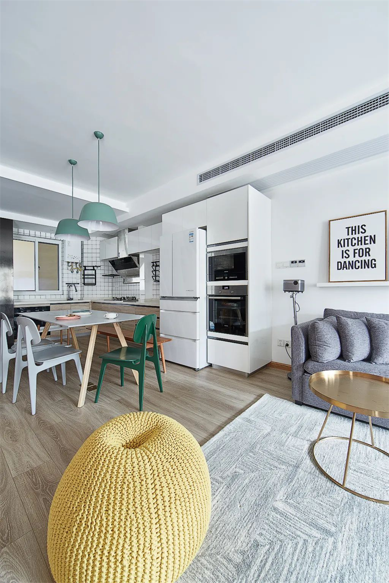 客厅是本案的亮点,白色墙壁为空间提供了明亮的背景。客厅的地板是原木色,赋予了房间自然的温暖感。墙上装饰着一些抽象的艺术画作,为空间带来些许艺术氛围。整个客厅的设计强调了开放感和清晰的线条,让人感到宽敞和时尚。