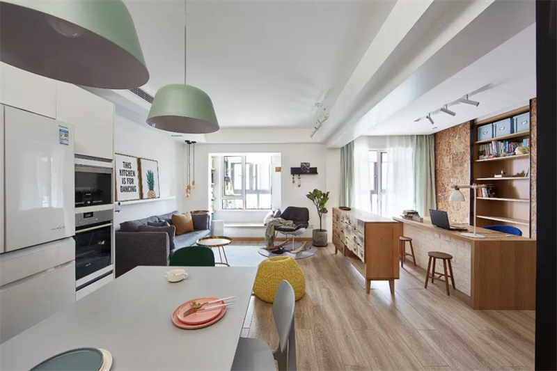 餐厅延续了客厅的设计,使用白色和灰色为主要色调。餐桌采用了简洁的灰白色设计,配合原木色地板,为用餐区带来了舒适感。顶部悬挂着一组现代感的吊灯,为餐区提供了柔和的照明